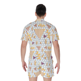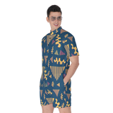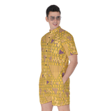 Short sleeve button up short jumpsuit featuring the "Gridlock" graphic print in a variety of accent colors.