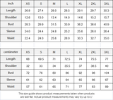 | Bust | 72 | 76 | 80 | 86 | 92 | 98 | 104 |
