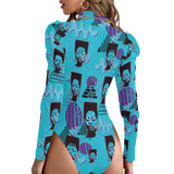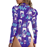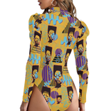 Celebrate your body forever in this high neck puff sleeve bodysuit. Featuring the "Hitop Squiggle Girl" graphic print in a variety of accent colors.